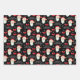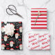 This Christmas gift wrapping paper features a graphic of Santa Claus and is accented with bows and snowflakes on the black background. This set offers coordinating sheets in red and white stripes and another with the calligraphy reading "Merry Christmas".