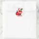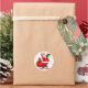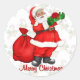 Wonderful Christmas holiday art with Jolly Santa Claus. He has a sack of Christmas gifts at his feet and is holding up a present.