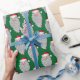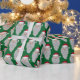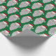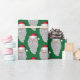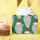 A jolly repeating pattern of Santa with long curly beard over a green background.