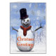 A jolly snowman wearing a top hat standing in the snow while snowflakes fall around him.