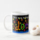 A large white mug with the words, 'This mug belongs to' in white lettering, followed by ''Jon" in handpainted paper collage, with a sprinkling of red, orange and yellow stars, on a black background. Microwave and dishwasher safe.