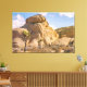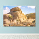 The image showcases a desert landscape with prominent rock formations and Joshua Trees. The large, light brown rocks are the focal point, exhibiting smooth, rounded shapes and deep crevices. Two Joshua Trees stand in the foreground, their spiky green foliage contrasting with the arid surroundings. The ground is covered with dry brush and low-lying vegetation.