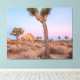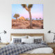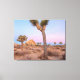 A panoramic view of a desert landscape with Joshua Trees silhouetted against a vibrant sunrise. The sky is a blend of soft pink and blue hues, creating a serene and tranquil atmosphere. The background features a cluster of Joshua Trees, their spiky leaves reaching towards the sky. In the distance, a rocky outcrop rises against the horizon, adding depth and texture to the scene.