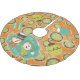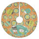 Joy and Peace Snowmen personalised holiday tree skirt features a vintage look orange background with big ball snowflakes of brown, blue, and olive green with four tree ornaments, snowflakes, and a cute snowman couple in top hat and winter knit hat and scarves on an aqua and orange banner with text that reads "Joy" and "Peace". This fun and colourful Joy and Peace Snowmen design holiday tree skirt makes a great gift or get one for yourself to enjoy for years to come!
