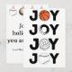 Joy filled holiday card with basketball, golf ball, volleyball and baseball.