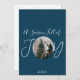 A custom holiday card with photo at the centre of the word Joy. Card can be personalised with message and photo for Christmas or holiday.
