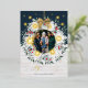Send some love and holiday cheer to your family and friends with our magical and festive rose gold foil Christmas card. Beautiful watercolor sage green eucalyptus and festive winter greenery hanging wreath with a special family memory photo displayed in the middle of the Christmas wreath. The photo is framed in rose gold foil with festive red cranberry accents. White & rose gold snowflakes are placed within the Christmas wreath arrangement. Simple falling snowflakes cascade from above, creating a cosy and magical winter scenery. "Joy Elevated" is displayed in elegant foil calligraphy. The background features a two-tone card white shiplap wood texture. Customise with your family signature and year. Reverse side with white shiplap wood texture and a faux gold bow and ribbon corner accent. Wreath illustration hand-drawn original artwork by Moodthology Papery.