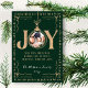Send warm holiday wishes with this elegant photo Christmas card featuring a timeless “JOY” design. The rich evergreen background and classic gold accents create a sophisticated look, while your favourite photo is beautifully framed inside a festive ornament. Hand-drawn border details add a charming, handcrafted touch. Personalise the message, family name, and year to make it uniquely yours. Perfect for sharing love and cheer with friends and family this holiday season.