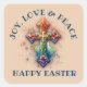 Joy, Love & Peace - Happy Easter with a colourful Christian cross and a watercolour splatter behind it, on a light background, for you to personalize as you choose.