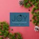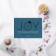Elegant and modern business holiday card features simple bold "JOY" real gold foil typography with round business logo placement within a Christmas ornament graphic. Personalise with your company name, the year, and a custom holiday greeting. Includes a deep teal green blue background colour and pattern of coordinating aqua and teal watercolor greenery on the back of the card.