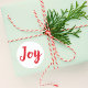 Holiday stickers feature red brushed script "Joy" text with a white background.