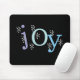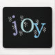 Holiday greeting cards, tote bags, mugs, T-shirts, and other holiday items with lavender, teal, and blue text and snowflakes reads "JOY"!