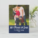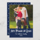Vertical holiday photo card design features a navy blue background (can be customised) and stylish "Joy Peace and Love" brushed script lettering. Personalise the custom greeting with your preferred text and add your favourite landscape photo (image space is 5" square). A pattern of white snowy dots appears on the back of the card. Photography © Storytree Studios, Stanford, CA
