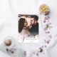 Our simple and elegant holiday photo card features your favourite full bleed vertical or portrait orientated photo, fading to white at the bottom. "Joy" appears as a gold foil script text overlay along with your names or family name, and the year. Cards reverse to a winter leaves pattern.