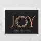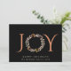 Minimal modern boho-inspired Christmas greeting card featuring the word "JOY" in an elegant terracotta typography with the "O" depicted by a watercolor wreath, all against a black background. You can personalise the "Happy Holidays" greeting and your name and the year.