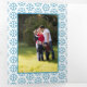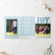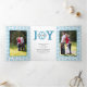 Joy to the world blue glitter snowflake Christmas Tri-Fold Holiday Card. The cover features the text: "Joy to the world" and a snowflake in blue glitter.Also there are photos on the flap and the left and right inside with a snowflake pattern border. Photography © Storytree Studios, Stanford, CA