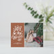 Joy to the world, the Lord is come! Customisable Christmas carol photo postcard featuring hand lettering, sparkles and foliage on a terracotta background. Personalise by adding names, photos, addresses and messages. Send wishes and greetings to family and friends with this rustic chalkboard Christmas postcard.