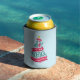 A can cooler with a fun and whimsical illustration. Typography design in the shape of a Christmas tree with some christmas ornaments and a star on top. Inside are the words: Joy to the world.