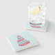 A stone coaster with a fun and whimsical illustration. Typography design in the shape of a Christmas tree with some christmas ornaments and a star on top. Inside are the words: Joy to the world.