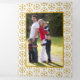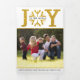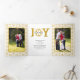 Joy to the world gold glitter snowflake Christmas Tri-Fold Holiday Card. The cover features the text: "Joy to the world" and a snowflake in gold glitter.Also there are photos on the flap and the left and right inside with a snowflake pattern border. Photography © Storytree Studios, Stanford, CA