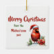 On this pretty Christmas ornament, a festive red cardinal bird perches on a red and blue floral Holiday bouquet. Text at the right side says "Joy to the World". The back has another image of a cardinal wearing a Santa Claus hat, and four custom text fields for you to provide your own greeting and signature. A great gift for friends and neighbours!
