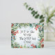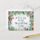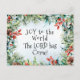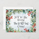 Inspirational quote Christmas postcard depicts a beautiful watercolor design of red berries, green leaves and pine cones and branches. It features the beloved Christmas carol, "Joy to the World the Lord has come." _
