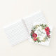 Inspirational quote Christmas notebook, journal depicts an elegant watercolor wreath with red and pink flowers, green leaves, and evergreens on a white background. It features the beloved Christmas carol, "Joy to the world, the Lord is come."