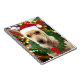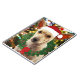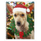 A digital art painting of a young pup ready for Christmas with a wreath, Santa hat and a decorated tree.