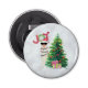 A bottle opener with a funny illustration. A cute llama wearing black sunglasses and a red santa hat. Standing behind a Christmas tree with festive presents. The word Joy written above his head in a colourful holiday font. Silver bokeh background. Whimsical and fun Christmas themed design.