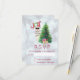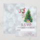 A Christmas RSVP card with a funny illustration. A cute llama wearing black sunglasses and a red santa hat. Standing behind a Christmas tree with festive presents. The word Joy written above his head in a colourful holiday font. Silver bokeh background with an icy blue border along the bottom.. Whimsical and fun Christmas themed design.