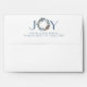 Beautiful holiday envelope in white with your return address information on back top flap in blue, showcased by the word "JOY" with letters "J" and "Y" in attractive decorative swirl paper in blue and silver, while letter "O" made of delicate watercolor holiday wreath in blue, silver, and cream tones. Inside with decorative swirl pattern in blue and grey silver tones. Collection with coordinating products available.