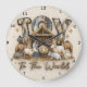 This beautiful, rustic clock depicts a traditional Nativity scene with Mary, Joseph, and the Baby Jesus in a humble stable, surrounded by a camel, sheep, and other animals. The word "JOY" is prominently displayed above the stable in a distressed, patterned font, with "To The World" scripted below, all set against a light wood grain background. The design may look real due to the high detail and three-dimensional texture in the artwork.