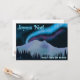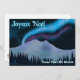 Purple and blue northern lights glow over snow-covered mountains on a cold night in Alaska. French text reading, “Joyeux Noёl” appears in glowing blue and white. Add your own additional text.