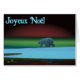 A polar bear roams the ice during the long polar night; the Northern Lights in red and green glow in the distance. French text reading, “Joyeux Noёl” appears in glowing blue and white.