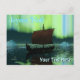 A slightly stylised image of a Viking longship sailing at night under the Northern Lights, there a couple of icebergs; most of the crew is asleep. French text reading, “Joyeux Noёl” appears in glowing blue and white.. Add your own additional text.