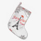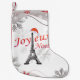 Joyeux Noel holiday design featuring the Eiffel Tower wearing a Santa hat and snowflakes. Paris themed Christmas design.