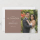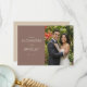 These wedding thank you cards feature a split design with a solid brown background on the left, elegantly complemented by off-white serif typography that adds a touch of classic charm. The right side showcases a joyful photograph of two formally dressed individuals surrounded by lush greenery and vibrant red flowers, creating a warm and celebratory atmosphere. The seamless transition between the structured text and personal photo balances formality with heartfelt warmth, making these cards perfect for expressing gratitude after your special day.