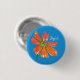 A joyful button pin decorated with a bright orange daisy flower with a bee visiting drawn with ink and painted with watercolor on a royal blue background. You can change the text and background colour to fit your needs.