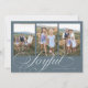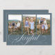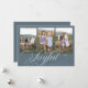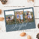 Minimal and modern holiday photo template card featuring 3 photos with a script text that says "joyful" at the bottom. You can also add another picture and message on the back. The background is slate blue.