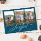 Minimal and modern holiday photo template card featuring 3 photos with a script text that says "joyful" at the bottom. You can also add another picture and message on the back. The background is teal.