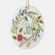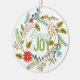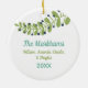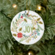 Pretty Christmas holiday ceramic ornament with a white background, branches, leaves, evergreen sprigs, berries,and flowers design on front with aqua and green text that reads Peace & Joy, an area on back to customise with your family name, first names, and current year!