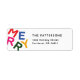 Step into a world of minimalist charm and vibrant joy with this delightful holiday design featuring your family name and address alongside colourful bold letters that spell out the word "Merry" using playful typography.