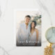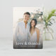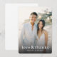 These wedding thank you cards feature a warm, romantic design with a central photograph of two individuals in formal attire against a softly blurred outdoor backdrop. The color palette is dominated by neutral tones like beige and light gray, complemented by hints of green and blue, creating a serene atmosphere. Elegant cursive typography reads "love & thanks," while the names are displayed in clean, uppercase sans-serif font, adding clarity and sophistication. The overall mood is joyful and heartfelt, perfect for expressing gratitude after a special celebration.