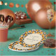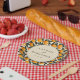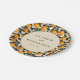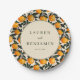This vibrant wedding plate features a playful pattern of bright orange fruits and deep green leaves on a soft beige background, creating a lively and inviting atmosphere. The design is centered around an elegant circular frame with classic serif typography, making it perfect for personalization. Ideal for celebrating joyous occasions, the cheerful motif and modern style add a festive touch to any event.