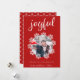 Joyful Red Script Snowflake Frame Photo Holiday Card. Winter holiday design with a photo surrounded by beautiful white snowflakes. The background is red with a snowflake pattern. Add your photo and customise the message and names.