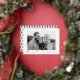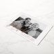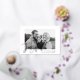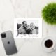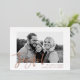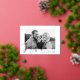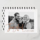 Modern foil holiday card featuring "Joyful" in hand-lettered rose gold foil script with a white background. Personalise the front of the card by adding your favourite horizontal photo and your names The reverse side of the card features a black and white modern Christmas tree pattern.