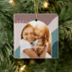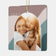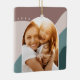 Add a favourite photo to this square ornament for a festive and memorable addition to your tree! Design features a vertical or portrait orientated photo in a unique arched layout, on a background of organic wavy stripes in shades of spruce green and light clay. Personalise the front with the year, and add your family name to the back.