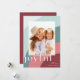 A chic and elegant holiday card design featuring a single vertical or portrait-oriented photo in a unique arched layout, framed by organic stripe shapes in soft shades of clay and spruce green. "Joyful" appears beneath your photo in understated type, with the year tucked inside the letter "o". at the top left, with your family name at the lower right. Personalize with your family name at the lower right for the perfect finishing touch to these nature-inspired Christmas 2021 photo cards.