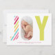 This design features the word JOY. The J is made of a colourful diagonal striped pattern, and the Y is a light green colour. The O will display your photo.
