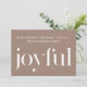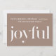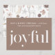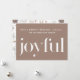 Lovely Christmas card features white joyful type on a neutral tan background with a simple white typography religious holiday message. The back of the card features a sweet holiday print with deer and pine cones in gentle colours.